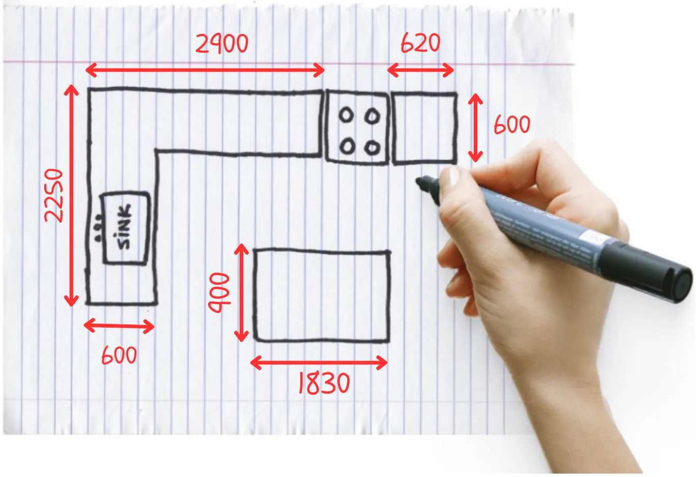 Draw a rough sketch of your kitchen worktop layout.