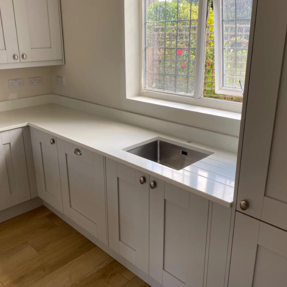 Bright, elegant, and effortlessly refined, the Ariel quartz worktop captures the timeless charm of natural stone with a contemporary edge. Its clean white surface is softened by delicate grey veining, creating a subtle yet striking aesthetic that elevates any kitchen design. Whether paired with bold cabinetry or soft neutrals, Ariel brings a versatile and sophisticated touch to modern and classic interiors alike.