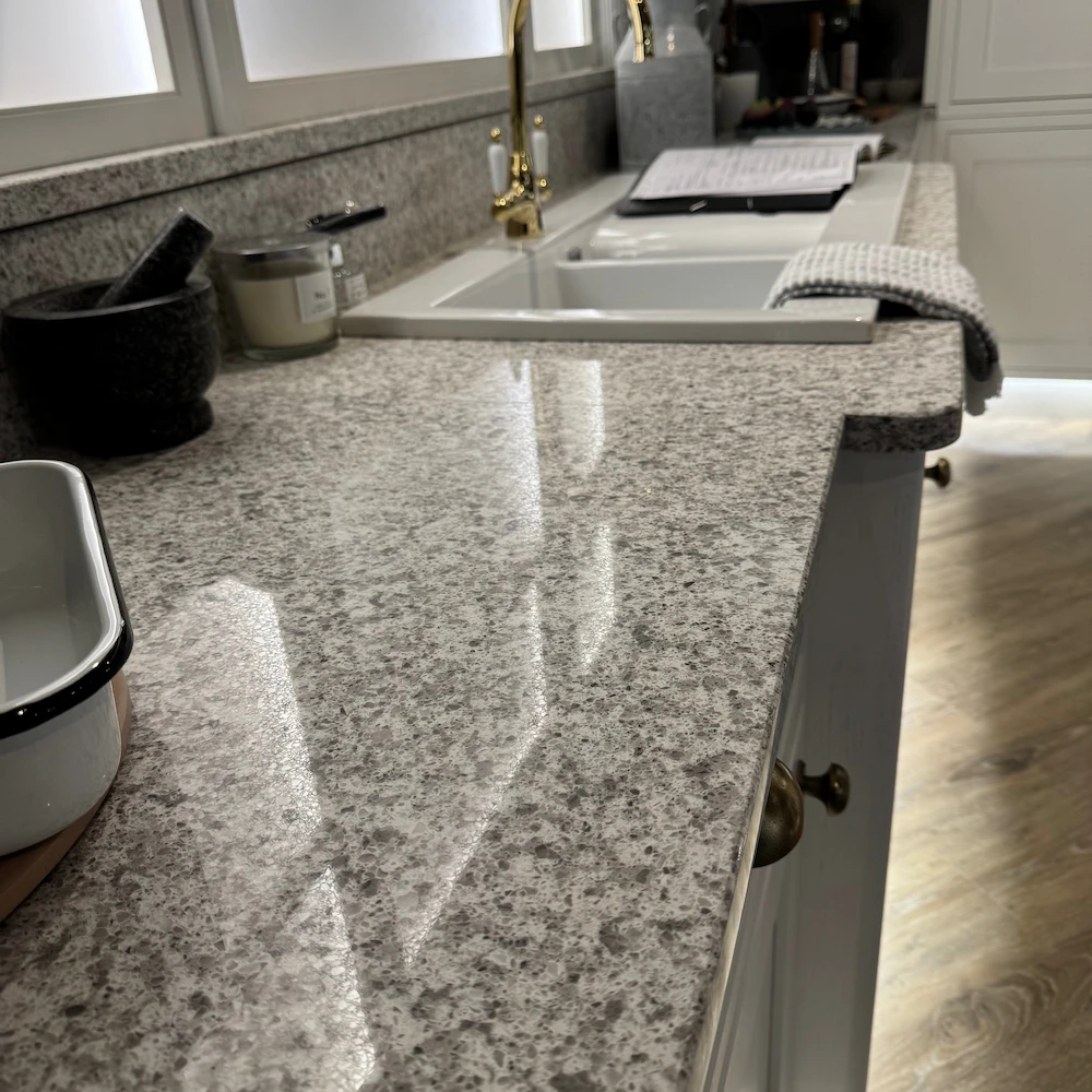Strong, modern, and effortlessly versatile, the Atlantic quartz worktop captures the natural essence of stone with its finely textured surface in cool grey tones. Speckled with subtle darker flecks, it creates depth and dimension, making it a stylish yet timeless choice for any kitchen.