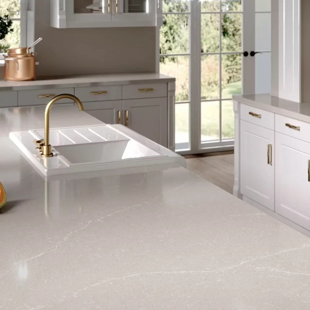 Whether used as a sleek backdrop in a modern kitchen or as a neutral anchor for bold cabinetry, this quartz worktop delivers sophistication that lasts.