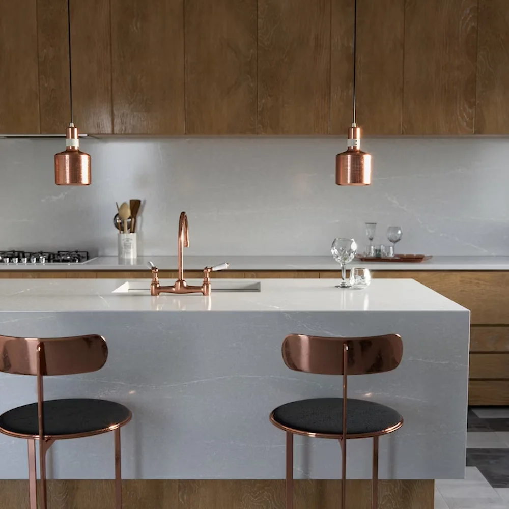 Subtle, refined, and effortlessly modern—the Light Grey Veined Quartz worktop brings understated elegance into the heart of your kitchen. Its soft grey base is delicately traced with fine white veining, creating a gentle marble-inspired look that feels both timeless and contemporary.