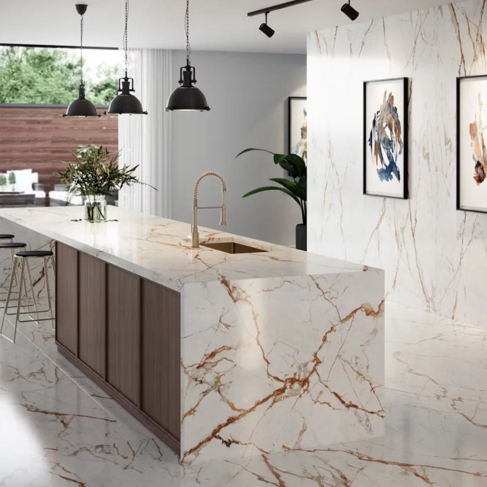 Opulent, graceful, and full of depth — Reverie embodies the poetry of natural marble with a warm, contemporary edge. Its creamy white canvas is elegantly streaked with golden and bronze veining, flowing organically across the surface like brushstrokes of artistry and light.